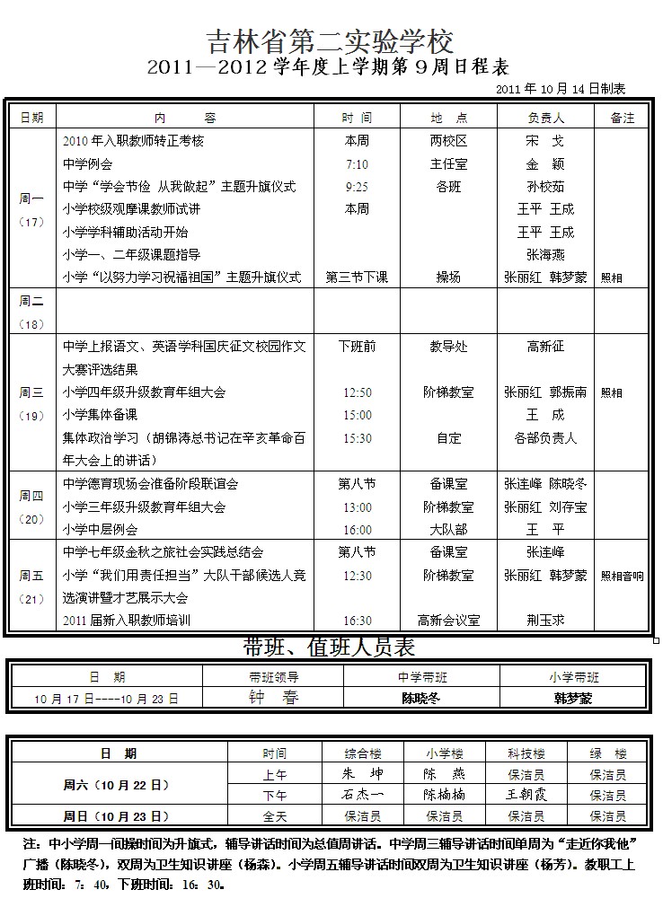 第九周日程表