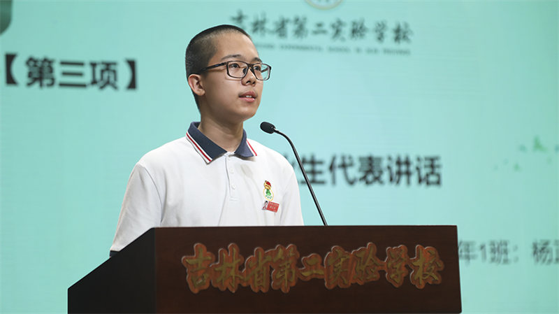 第36届校学生会团委副书记九年1班杨正钰同学代表毕业生讲话。大队委、学生会一直有他积极担当的身影,他讲述对老师的温暖情谊,对未来的美好憧憬。
