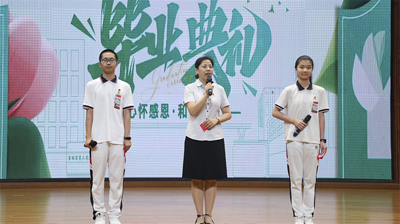 中学部德育副主任孙明老师、第35届校学生会主席九年1班韩济帆同学、第35届校学生会副主席九年5班邢枫同学联袂主持毕业典礼