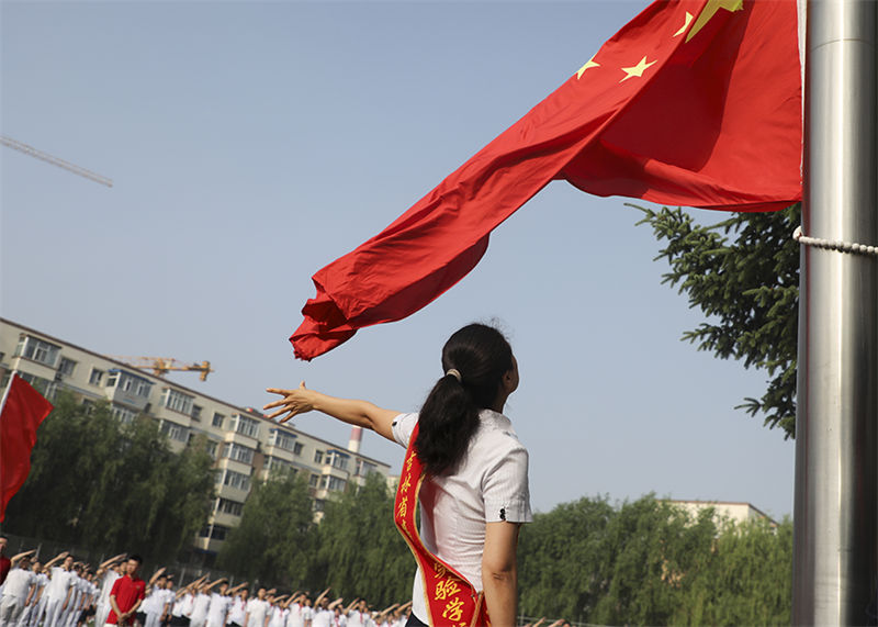 为者常成,行者常至。九年级年级组长赵海英老师担任本次升旗仪式升旗手,九年5班吴储言、九年2班潘胜雅同学担任护旗手。国旗仪仗队由九年级品行示范、乐学善思的学生代表组成。情怀温厚的师长培养出眼界开阔,明朗从容的学生。国旗之下,师者牢记教育责任,学生展示青春风采,逐梦之旅,携手同行。