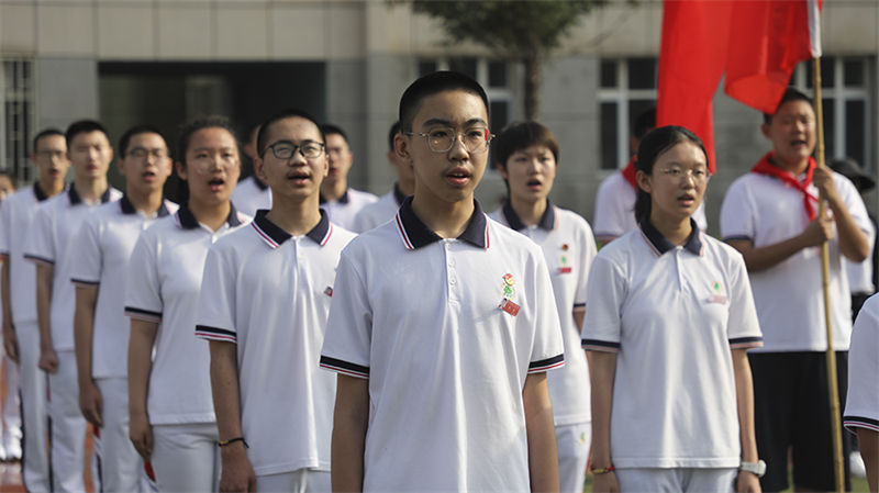 国旗下庄严肃立、高唱国歌