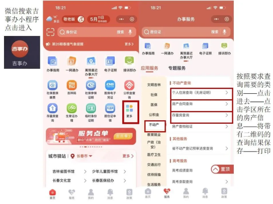 存量房信息查询方式:打开“吉事办”小程序——更多——不动产——存量房查询——点击拟入学房产——保存——打印