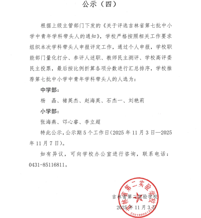 吉林省第七批中小学青年学科带头人申报公示
