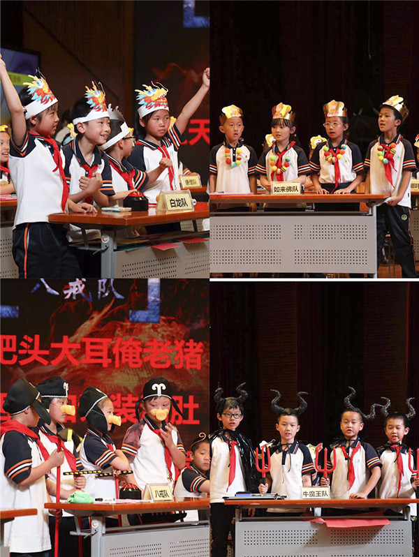 第一部分是小组赛。每个班级派出四位“西游小达人”组成战队代表班级参赛,每个战队代表一个西游人物,伴随着精彩的亮相、响亮的挑战宣言,装扮起来的选手们精彩亮相!同时,小主持人们以及王宇、王雪老师组成的“宇加雪”组合闪亮登场,宣布比赛规则。