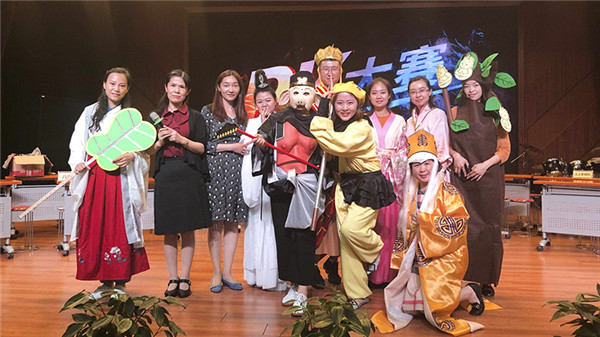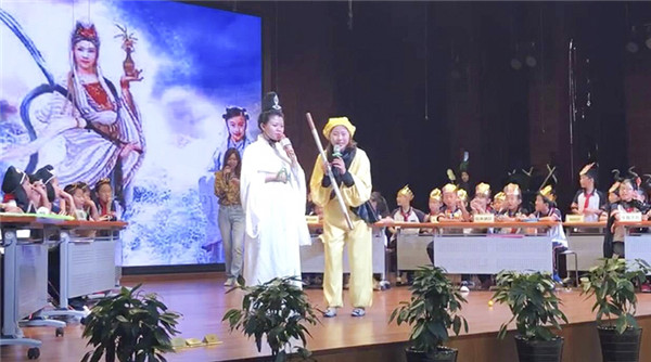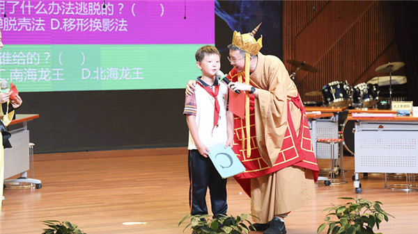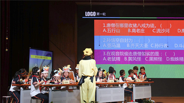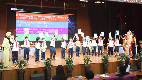 第二环节比赛是抢答题环节,由黄丽婷老师主持。第一次接触抢答器的小选手们丝毫不怯场,现场灵活应变。抢答题分为三部分,首先是“大家来找茬”,各位二年级的老师齐上阵,扮装西游人物,倾情演绎,在竞赛之余带给孩子们快乐。学生们在开心大笑中仍不忘发现情节与原著不符之处,师生同台,留下了难忘的西游记忆。