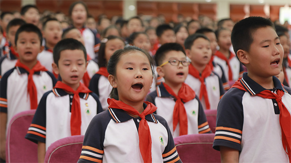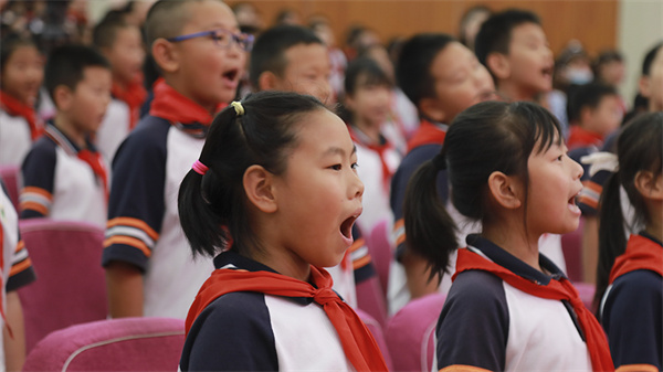 合唱团的同学们在赵越老师的指挥下,在开学典礼现场带来《童谣唱给太阳听》。在新的学年里同学们在党的领导下沐浴着阳光,茁壮成长。