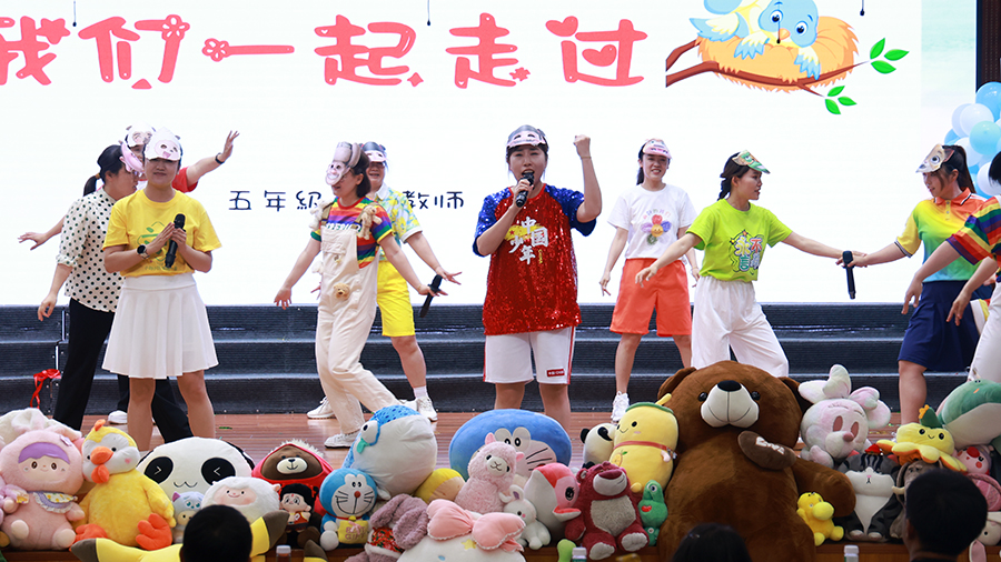 随着具有神秘感的旋律响起,老师们化身“动画卡通人物”惊喜登场!他们头戴卡通人物面具,俏皮的动作配合灿烂的笑容,瞬间将全场拉回无忧无虑的童年时光。老师们歌唱《我们》,用饱含深情的歌声与优美舞姿,诉说着陪伴与守护的心意,每一个音符都传递着对学生们成长的期许。当歌声与掌声交织,舞台化作爱的海洋,这份来自师长的温暖惊喜,不仅将童歌会推向高潮,更在孩子们心中种下了感动与力量的种子,让他们在成长路上,永远心怀温暖,一路生花。
