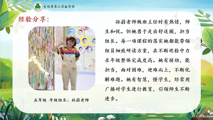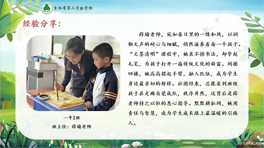 组长杨帆老师介绍薛瑜老师时说:“‘文墨清明’课程中,她虽不擅书法,却拿起毛笔,为学生打开一扇传统文化的新窗。间操回楼,她高高摆起手臂,融入队伍,成为学生身边最亲切的榜样。社团结束,总能看到班级学生在走廊自觉成队,秩序井然,这背后是薛老师持之以恒的悉心指导。默默耕耘间,她用责任与智慧,成为学生成长路上最温暖的引路人。”