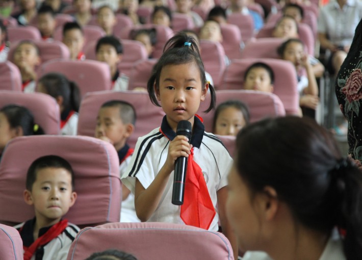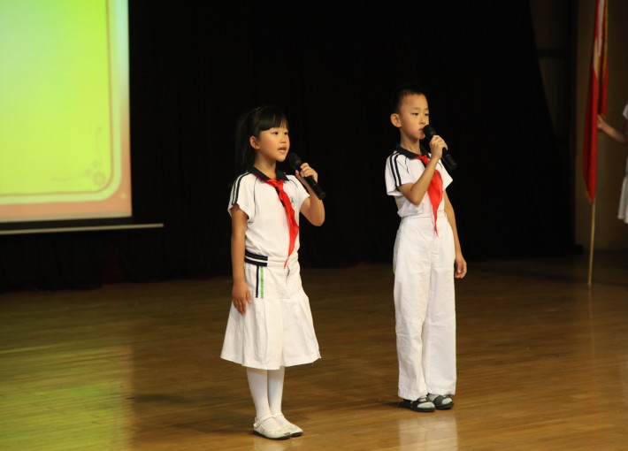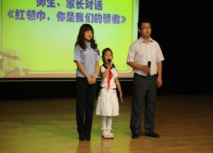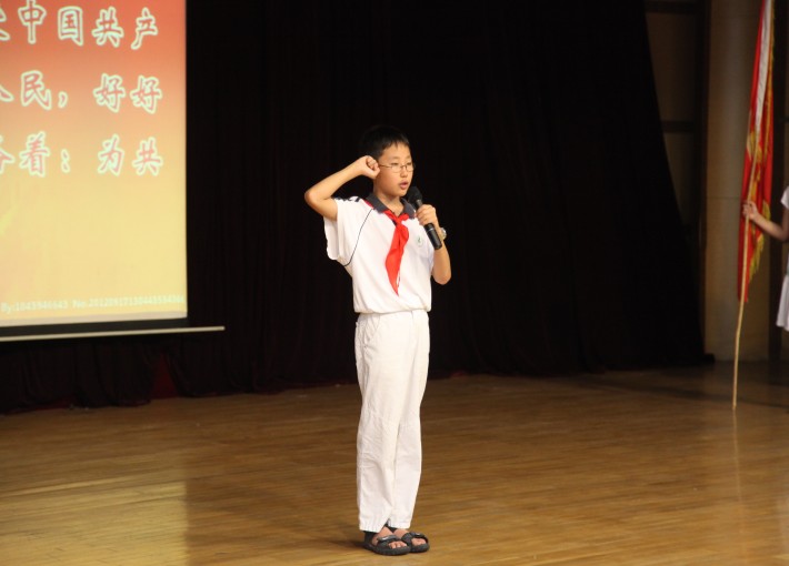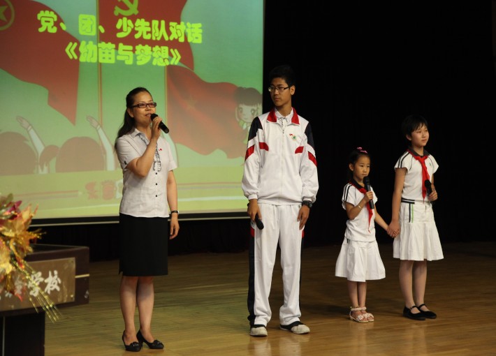 党员代表小学部党总支副书记、全国师德标兵李婧伟老师,团员代表陈德雷同学,少先队员代表李梓祎同学向新少先队员代表张瀚予同学表示祝贺