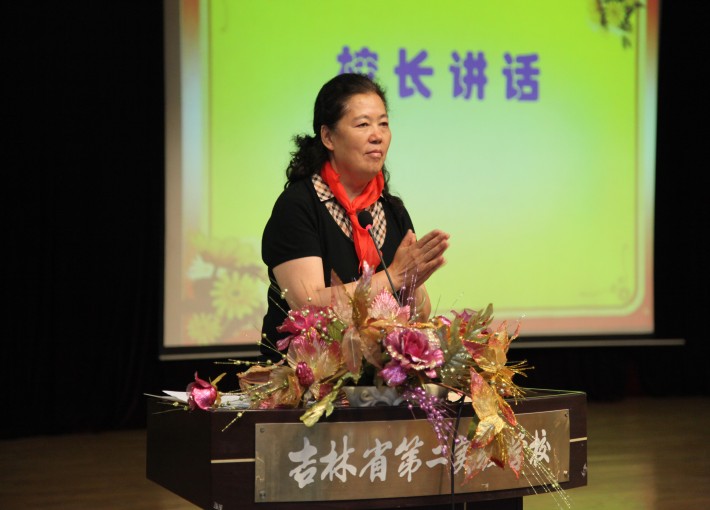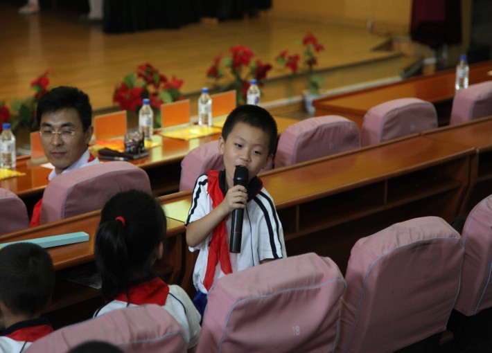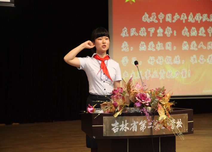 优秀少先队员代表在给长春共青团市委王云飞部长献上少先队员最崇高的敬意