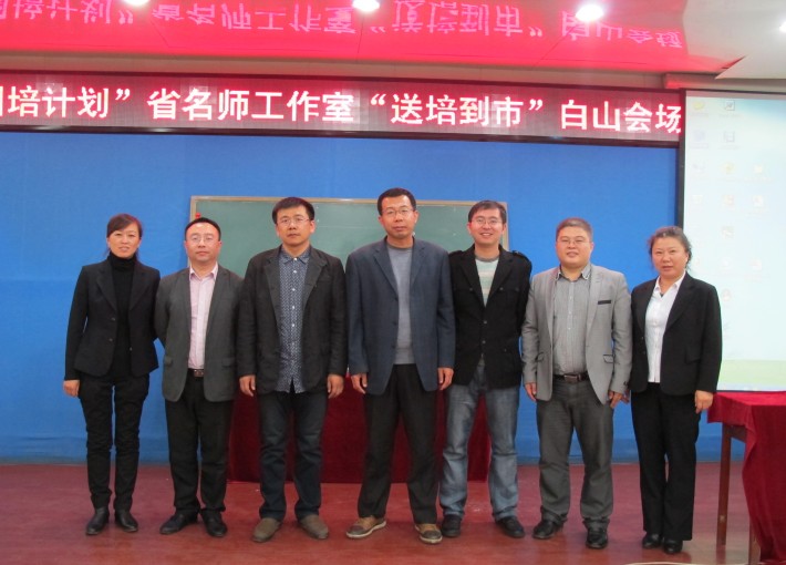 王成数学名师工作室主持人及其成员与白山市教育系统领导合影