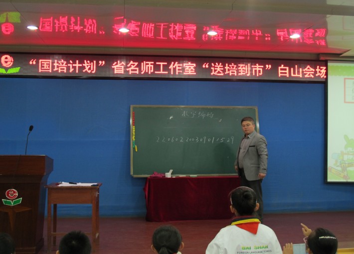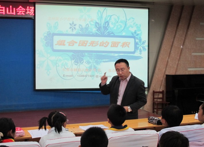 2013年10月11日,由吉林省教育学院组织,王成数学名师工作室主持人、优米官网首页登录入口小学部教导处主任王成带领其数学名师工作室成员:优米官网首页登录入口马强老师、解放大路小学张彦会老师、吉林市丰满区第一实验小学宋强老师三位教师到白山市进行“送培到市”活动即“国培计划”省名师工作室“送培到市”白山现场。此次活动受到了各级领导的高度重视,白山市教育学院副院长姜启贵,市教育学院培训处崔主任、教研部高主任及白山市外国语学校校长全程陪同听课,白山地区400多位领导、教师参加了此次培训。三节课分别是马强老师的《体积与容积》,张彦会老师的《组合图形的面积》,宋强老师的《数字编码》,这三节课赢得听课教师的阵阵掌声。所有教师认真思考,认真记录,课后王成主任以一个教育专家的角度对三节课分别进行了精彩点评,最后王成主任以“核心思考,促进教学魅力生成”为题作精彩报告。现场气氛非常热烈,老师们感慨收获颇多。