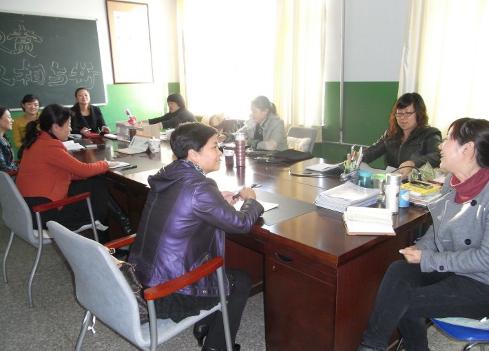 二年组全体教师在办公室交流经验