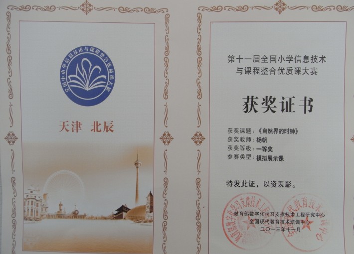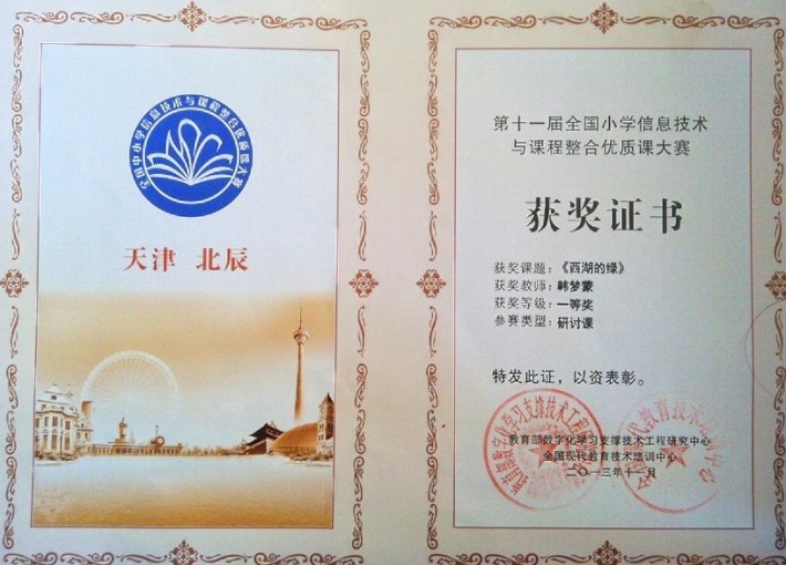 由教育部数字化学习支撑技术工程研究中心、全国现代教育技术培训中心、东北师范大学联合举办,由天津教育局承办的第十一届全国小学信息技术与课程整合优质课大赛暨现代教育学术年会于2013年11月10日在天津召开。在信息技术与课程整合优质课大赛中,分三类比赛项目:研讨课、模拟展示课、同题异构观摩课,共485人参加决赛,由专家评审组评选出一、二、三等奖。经过激烈的现场评比,我校韩梦蒙老师研讨课《西湖的绿》、杨帆老师模拟展示课《自然界的时钟》均获得一等奖。
