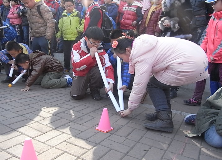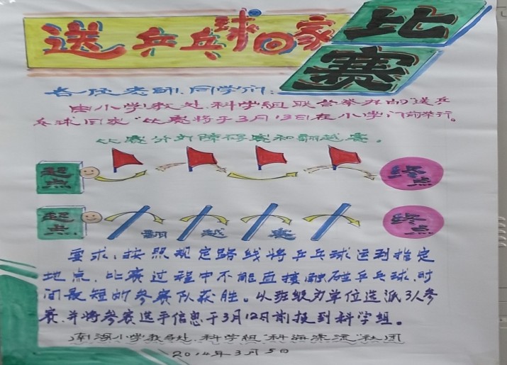 2014年3月13日,在小学部教导处王成主任的倡议下,科学组全体教师的策划和组织下,小学部举办了首届“送乒乓球回家”活动,小学部29个班级全部参加比赛。 本次比赛体现了科学和运动的结合,赛前老师们没有过多的指导,只把规则讲清,至于如何应用全靠学生自己动脑、动手设计工具和方法,很多班级的同学们器材使用合理,效果显著,效率较高,体现了活动的科学性,锻炼了学生的创新能力和动手能力。在比赛中同学们或直接或间接的利用空气动力或者磁力等方法推动乒乓球运动,极大的锻炼了学生的肺活量和对游戏工具的控制能力。比赛时,吸引了很多同学驻足观看,观众队伍格外井然有序,展现了我校学子特有的风采。 在比赛中2.3班、1.6班、1.2班、2.1班、2.2班、2.4班均在2分钟内完成;3.4班使用的工具简单合理,只用了16秒就完成了比赛,创造了本次比赛全校最好成绩;5年5班创造了五年组最佳成绩29秒,虽然不是全校的最佳成绩,但他们的运球过程完全按照比赛规则进行,让乒乓球依次绕过了每一个障碍物,最后到达终点。 虽然本次比赛已经落下帷幕,但是科学组还将举办更加丰富多彩的活动,敬请期待。