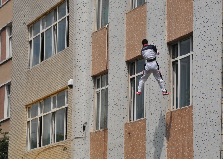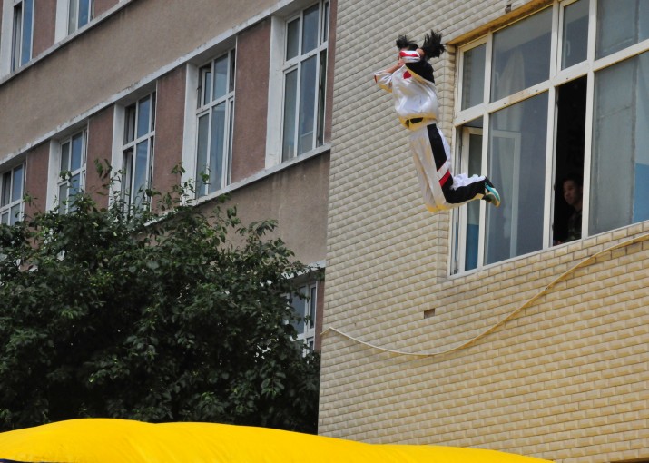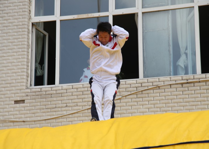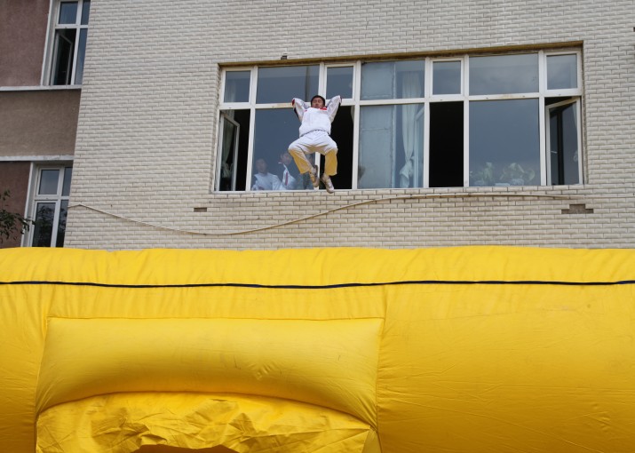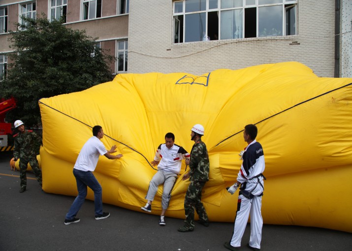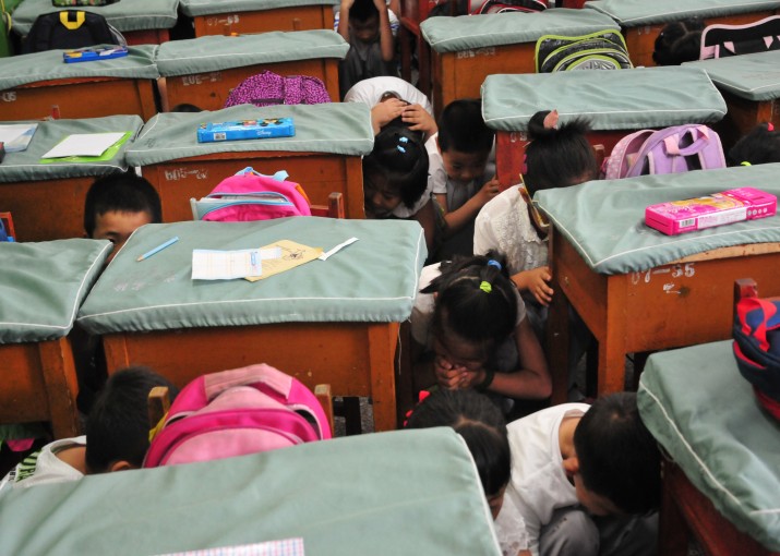 第一环节,中、小学生在遇到震灾、火灾时躲避、疏散演练