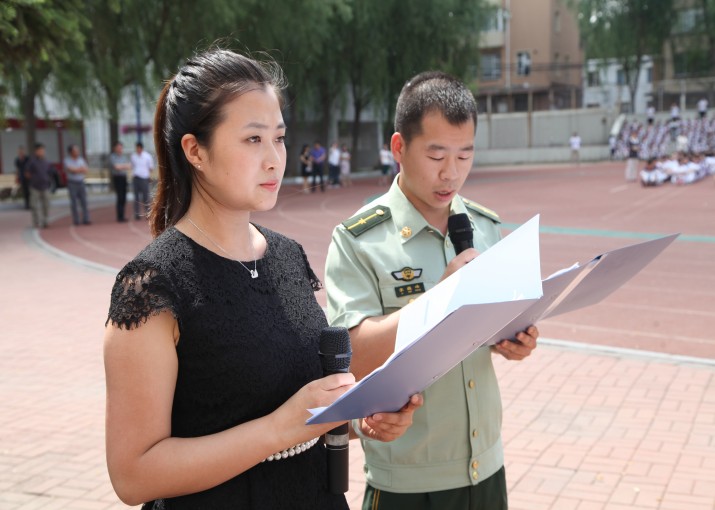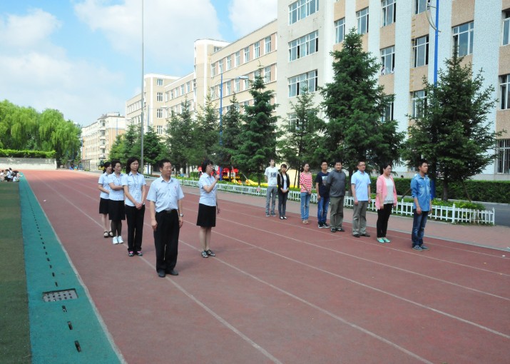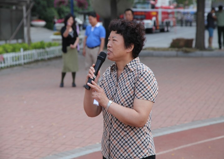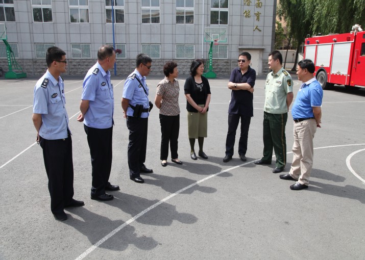 宋戈校长、关尚敏书记、王宏杰副校长、省教育厅安全处卢林处长、朝阳区消防大队杨俊岭大队长在演练前布置工作