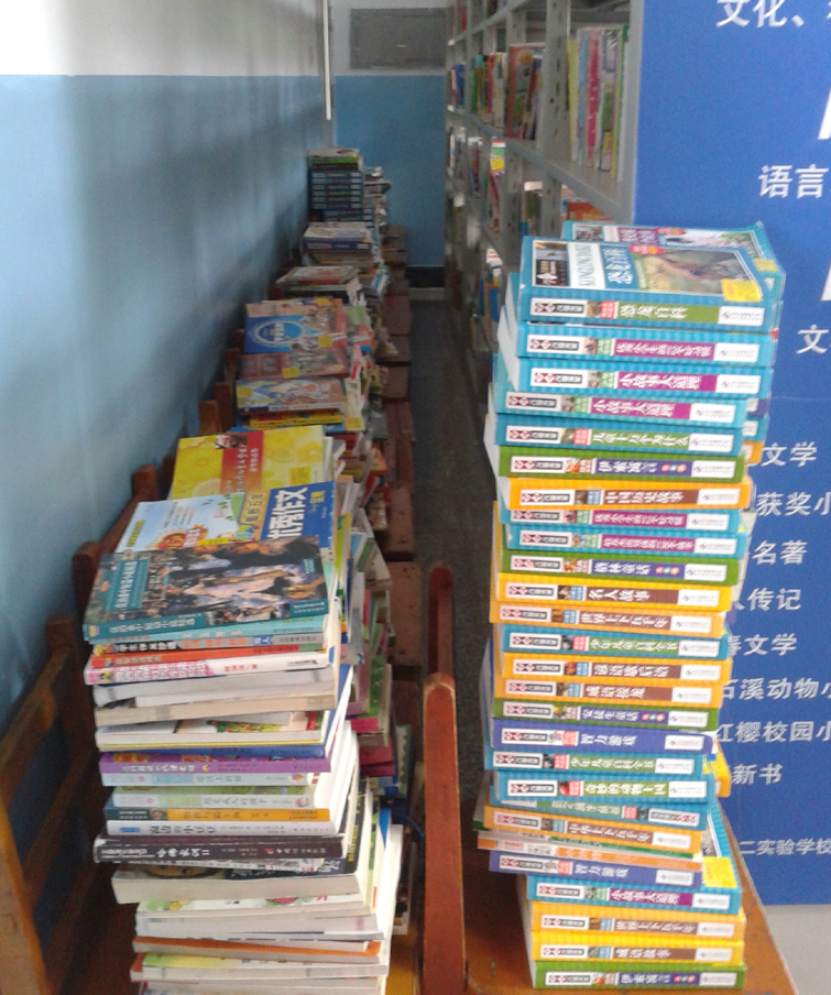 各班上交的部分图书整齐的摆放在图书馆里,加工后上架提供给学生阅读