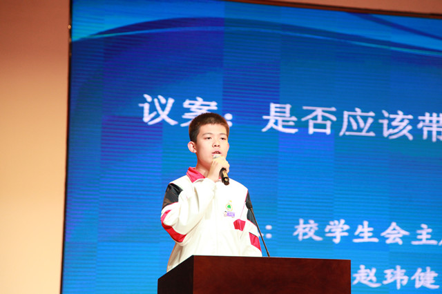 校学生会主席赵玮健同学针对学生是否应该携带手机提出议案