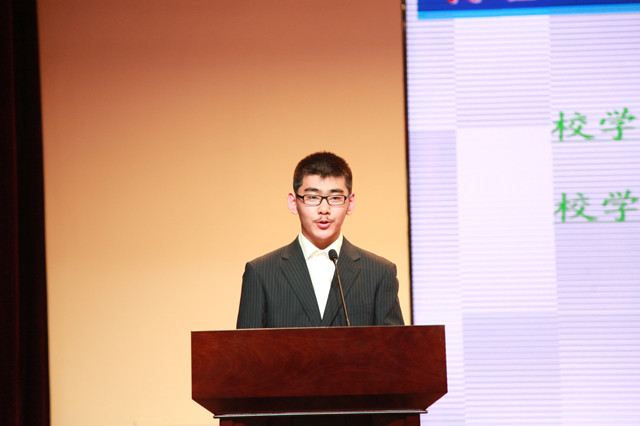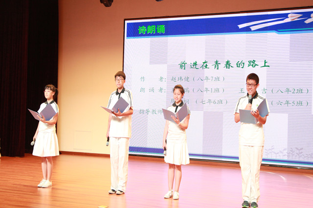 接下来,在简短回顾了过去一年中学部举办的校园活动和社团活动后,主持人结合“互助学习,自主成长”的话题向现场的观众同学们提问,深入生活,去寻找学校举办并鼓励同学们自主举办此类活动的意义——促进同学们的自主成长,珍惜宝贵的青春时光。一首由学生撰写并朗诵的《前进在青春路上》诗歌过后,大会的环节继续展开。
