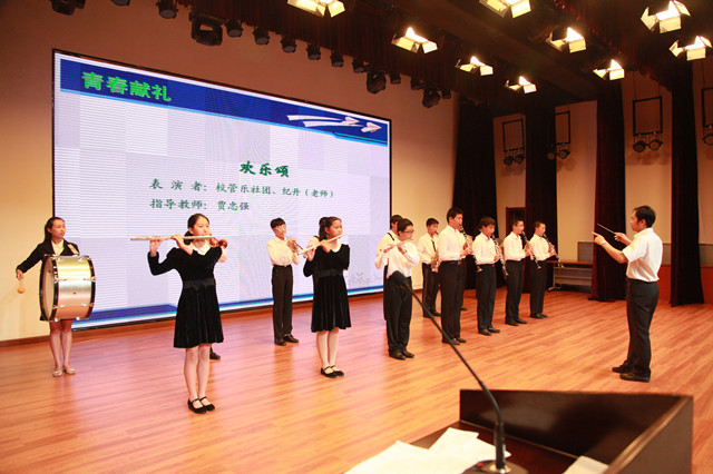 由音乐组孙校茹老师、贾中强老师组建的我校第一支管乐队随后为现场师生和家长演奏了一曲《欢乐颂》,引得现场久久不息的掌声。