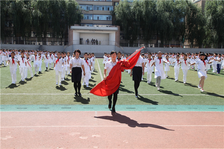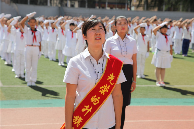 担任本次升旗仪式的班级是四年五班,班主任是陈燕老师。担任升旗手的是优秀年级组长代表刘向峰老师,担任护旗手的是优秀青年教师代表张媛老师和罗晶晶老师。四年五班的国旗仪仗队由四年五班全体少先队员组成。国旗仪仗队在整个升旗仪式的过程中挺拔肃立,这也是四年五班的少先队员们在教师节上最珍贵的献礼!