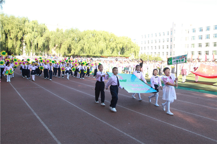 一年七班的小同学们迈着整齐的步伐,有力的摆臂,精神抖擞。