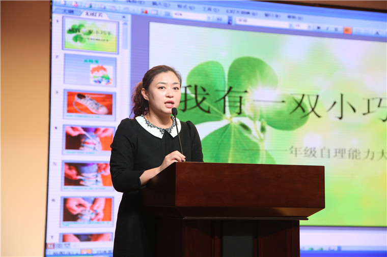2014年11月25日下午1时,省二实验学校大报告厅召开了一年级“我有一双小巧手”自理能力大赛,教导处王成主任、马建梅副主任出席了本次活动。 本次活动由一年组老师精心设计,以学生展示为主,共设有三个比赛项目,分别是:系鞋带、整理书包、叠衣服。 各班比赛选手由现场随机确定,第一项系鞋带比赛,首先由林媛老师讲解系鞋带的方法技巧,孩子们听的聚精会神,接下来的比赛环节里小主持人宣布了比赛规则,每班的比赛选手整齐准备,比赛开始了,小选手们都积极地行动起来,紧张地参与其中,表情庄重投入。小选手们各个表现不凡,动作灵活迅速,台下的小观众们按捺不住内心的激动与喜悦,为之呐喊、助威,现场气氛异常活跃与热烈,首先完成的选手获得了笑脸奖励。 第二项是整理书包比赛,孙丹丹老师讲述了班级里一位同学在家整理书包的故事,从开始的手忙脚乱到整齐有序,我们看见了孩子的收获和成长,下面的小观众们跃跃欲试,随机产生的选手们台上表现非常出色,赢得了场上所有老师同学热烈的掌声喝彩。 如何把我们漂亮的小外套整齐叠好,杨晓溪老师有小妙招,第三项叠衣服比赛,杨老师现场示范了叠衣服的方法,选手们快速整理,下面加油声不断,而后全体一年级同学利用手中的大衣动手一起叠衣服,完成后脸上露出了自豪的笑容。经过激烈而快乐地角逐,比赛圆满的结束了。 通过这次活动,提高了学生们的自理能力、动手能力,让孩子们懂得只要我们用心学习就能成为生活当中的小能手,明确了自己的事情要自己做,展现了孩子们自理能力方面的迅速成长和积极进取的精神风貌。