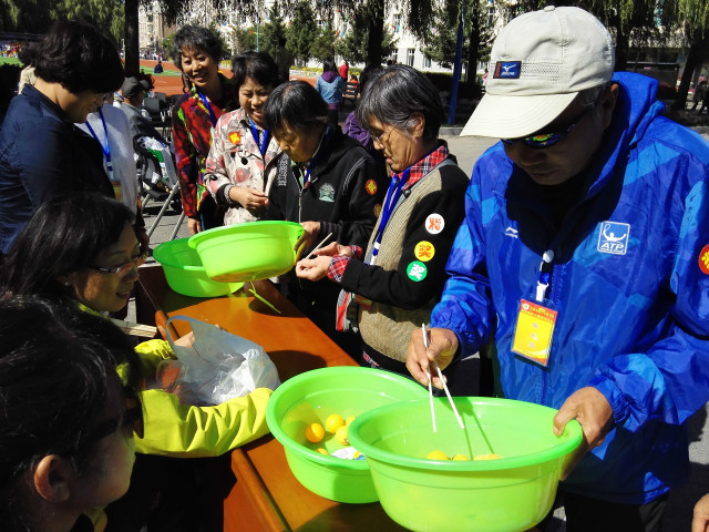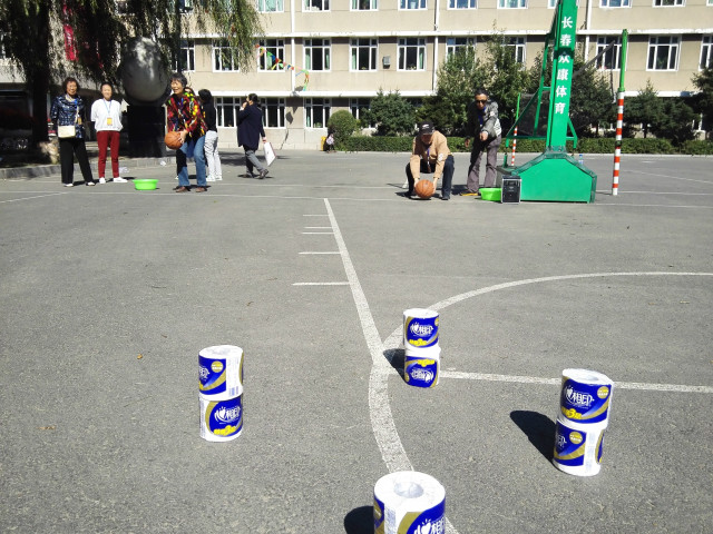 今年活动的主题是“运动收获快乐健康相伴晚年”。在校工会的组织协调下,在校办、总务、图书馆、中学体育组各位同事的大力支持下,趣味运动会取得了圆满成功。工会、体育组根据老年人的身体条件和心理特点设立了拖球接力、乒乓球搬家、创意保龄球和幸运接力等项目,这些项目既适合老年人的体力,又具有一定的趣味性。参加运动项目的老师中既有耄耋之年的老教师,也有退休不久的“小年轻”。他们一面互致问候,一面饶有兴趣地参加各项比赛。他们精神矍铄,既遵守游戏规则,又开朗豁达,不论竞技输赢都很高兴。趣味运动场面气氛热烈,洋溢着他们的歌声与微笑。