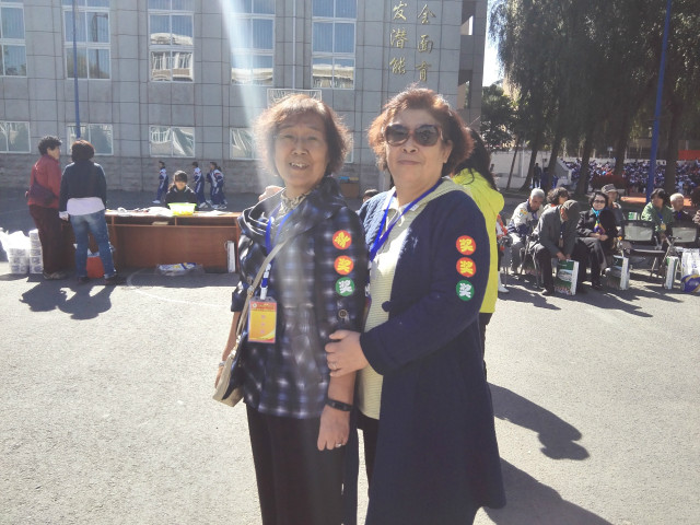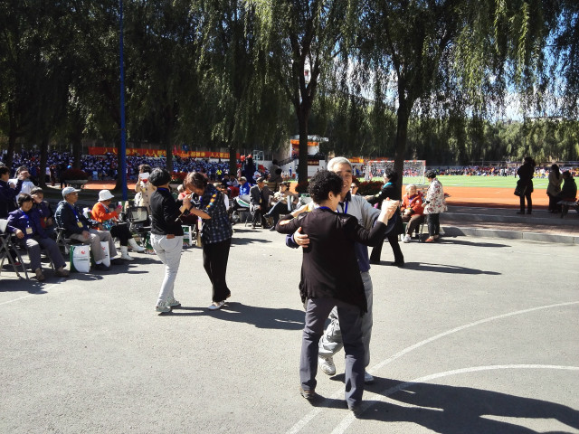 比赛之余,退休教师随着音乐节拍跳起轻快的舞蹈,表达心中的欢愉。同时,他们还观看了小学部特色检阅队伍的展示,并报以一致好评。