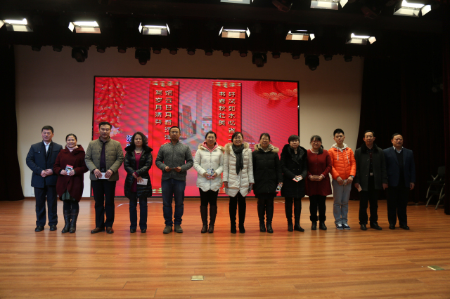 获得优秀对联的书写教师上台领奖(优盘)并合影