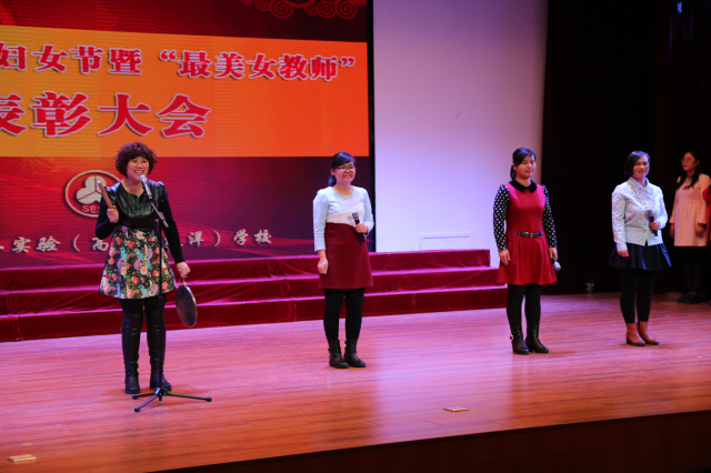 为表彰先进,树立典范,弘扬时代女性精神,展现时代女性风采,特别是弘扬我校女教职员工爱岗敬业、乐于奉献、爱生如子、为人师表的崇高师德风尚,学校于近期组织开展了2015-2016学年度“最美女教师”专项评选活动,并于3月8日举行了隆重热烈的庆祝“三八”妇女节暨学年度“最美女教师”、“巾帼标兵”表彰大会。学校领导班子、三校区全体女教职员工、各部门一把手负责人参加了大会,活动由在省市职工读书、法律知识竞赛中赢得优异成绩奖项的代表:中学部马天放老师、小学部吕建老师主持。