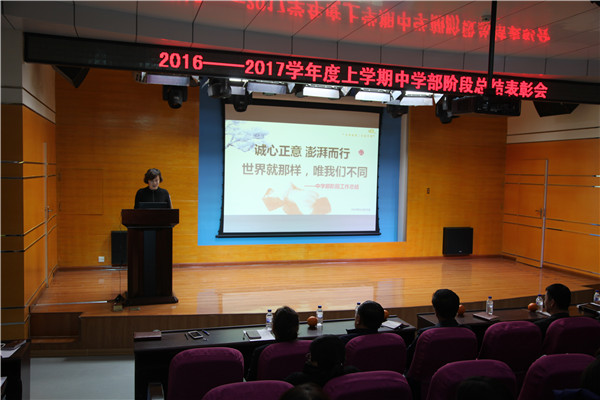 校长的声音 遇建勋副校长代表校领导班子肯定了中学部所取得的一系列成绩,高度认同中学部质朴、坚守的工作作风。同时提出希望中学部继续以教学为中心,提升教师的学科横贯能力,不断促进学生学习力的培养,搭建学生个性化成长的平台。此次期中总结大会在阵阵掌声中圆满结束。