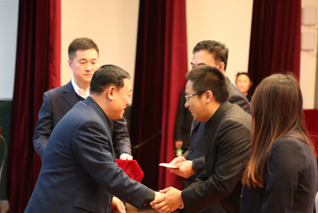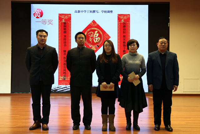 按照既定规划,大会首先对2017年春节学校征集春联评选活动进行了总结表奖。在陈杰校长倡议下,在石馨副校长指导部署下,2017年春联征集评选活动得到语文等学科众多教师积极参与撰写,共收到来自三校区六部门春联183对,其中高新小学65对;南湖小学38对;高新中学36对;南湖中学23对;远洋小学12对;远洋中学9对。最终评选出一等奖4名、二等奖7名。会上,由王洪杰书记对一等奖获得者进行了颁奖表彰并与之合影留念,由遇建勋副校长对二等奖获得者进行了颁奖表彰并与之合影留念。正是妙对偶成胸怀家国事,联林出奇培育桃李香。