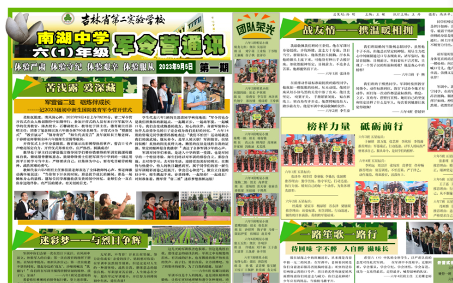 国防教育军令营课程中,同学们站军姿、行进间正步走、齐步走、行进间分列式、军体拳样样表现优良。特色量化板,板面分明:五星标兵光荣榜,明星小组龙虎榜,明星班级风采榜。闪亮照片耀你我,军中榜样肯争先。每日讲评人员踊跃、鼓励生生、班班争先锋。