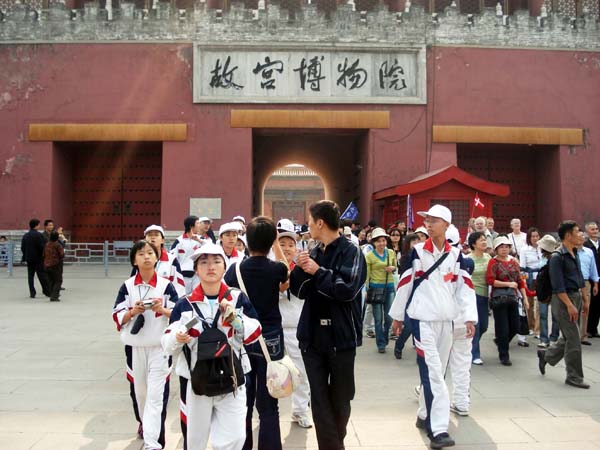 满载第一天的收获,我们整理行囊,又有开始了第二天的考察生活。同学们怀着崇敬的心情参观了庄严肃穆的毛主席纪念堂,大家用手中的鲜花寄托了对伟人的哀思。在庄重浑厚、宏伟典雅的天安门城楼,同学们俯瞰金水桥畔的华表,遥望广场上的人民英雄纪念碑,一种民族自豪感油然而生。行走在“城中之城”的紫禁城,同学们既为美伦美奂的宫殿楼宇所折服,又为后花园的奇树古柏所吸引,一个半小时的行程让大家意犹未尽。在景山公园,我们稍做停留,整理心绪。午餐过后,我们来到了北京特产市场,导游向我们讲解了果脯的制作工艺,学生们用精心挑选的果脯表达对家人的爱。之后我们又来到了索尼探梦,高科技产品让学生认识到生活处处有科学,梦想成就未来。带着喜悦,收获梦想,我们结束了第二天的旅行。