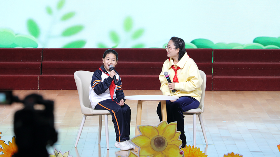远洋小学大队辅导员宗明铭老师和大队宣传委员胡欣熙同学讲述少先队员的成长过程