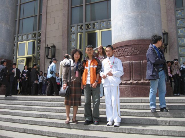 指导老师周馥与王洋、陈炳光在人民大会堂门口合影
