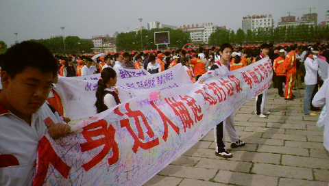 5月20日早九点,长春市“从我做起,从身边人做起,做文明市民,从不乱扔垃圾开始……”万名中小学生签名启动仪式在文化广场举行,我校师生一行6人参加了此次活动。此前,校团委向全校同学发出了该项活动的倡议并举行了做文明市民的签名活动。