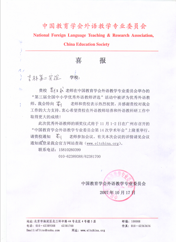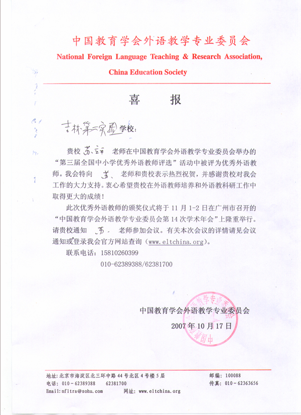 在“第三届全国中小学优秀外语教师评选”活动中我校初中组苏立平、小学组荆玉求老师被评为优秀外语教师