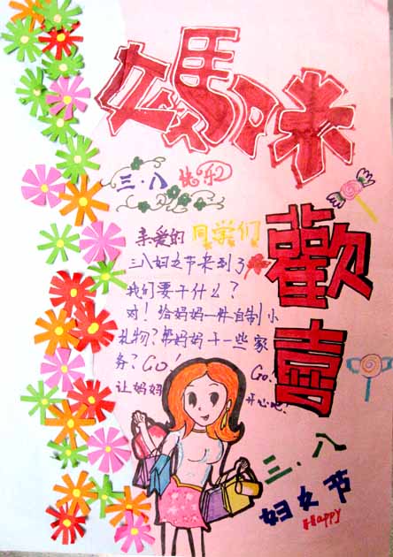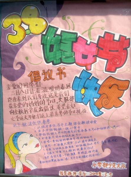 3月8日伴着温暖的春风既将来到我们的身边,这是我们最亲爱妈妈的节日 ,小学部少先大队向全校同学发出倡议,希望在这一天.为我们的妈妈送上最真挚的祝福! (海报指导教师:李乐)