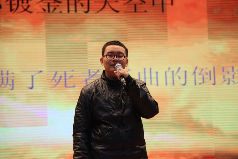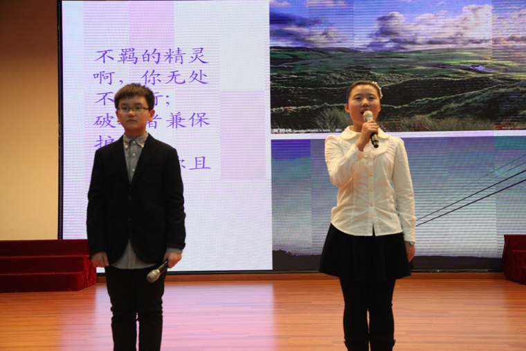 春意初现,绿芽萌发,在这播种希望、描绘锦绣的季节里,在这挥洒豪情、憧憬未来的春天里,2015年4月13日下午,中学8年级全体师生在大报告厅成功举行了“书香浸润,诗韵悠长”诗歌朗诵大会。参加本次大会的领导有校党委陈杰书记、教导处张连峰主任、高新征主任、团委书记李丽莉老师、特约评委任义芬老师。