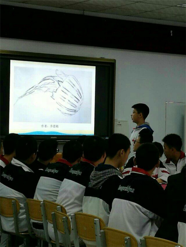 乔思铭同学在解读他所画的水母代表着意志坚定、向往自由的青春之美
