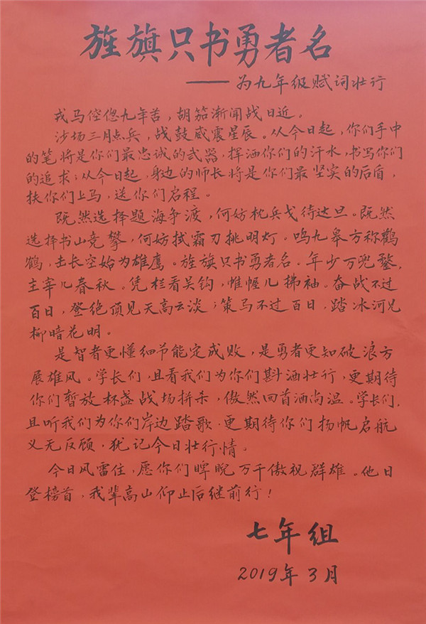 “沧海横流,方显英雄本色”,人生总是在竞争中不断超越,生命总是在拼搏中熠熠闪光。省二的学子们,中考的战鼓已经擂响,希望你们倍加珍惜这最后的百日,带上最锋利的头脑,怀揣最细致的心灵,紧握最有利的拳头,上好每一堂课,做好每一道题,走好每一步路,为百日后的中考奋力拼搏!
