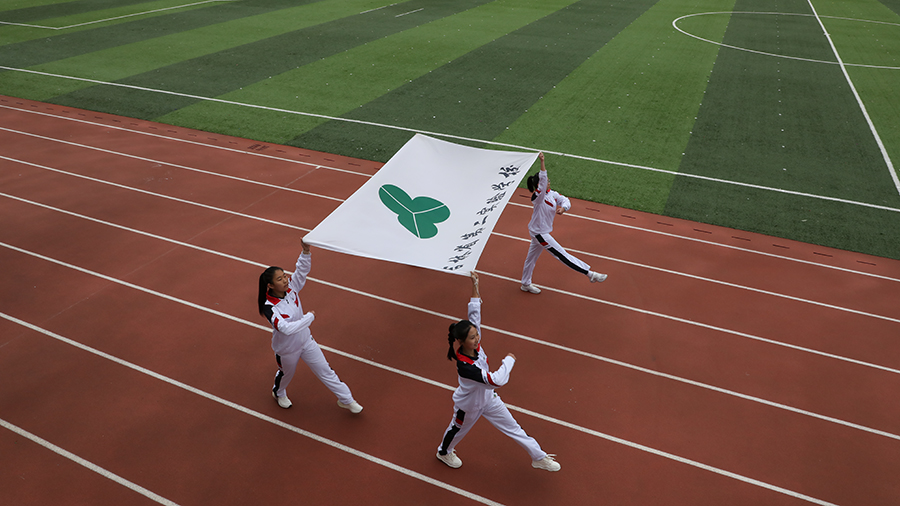 运动员入场环节由团委书记兼大队辅导员丁旭老师和地理教研组长刘颖老师共同主持,伴随着激昂的《运动员进行曲》,九年级学生代表组成的国旗队、校旗队、会旗队昂首挺胸、踏入会场;七年级的优雅女生组成的花束队阳光雅正,朝气蓬勃;八年级俊朗男生组成的刀旗队气宇轩昂,身姿挺拔。