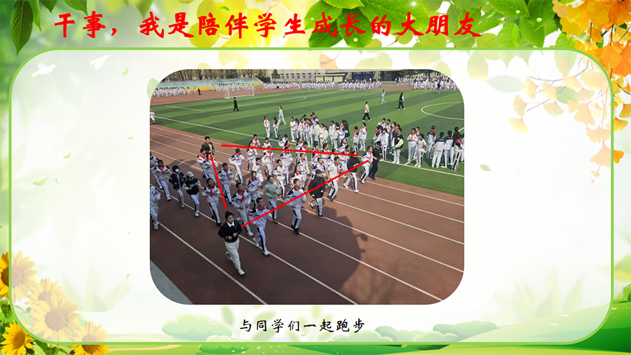 纪老师与学生一起跑操,陪伴学生成长