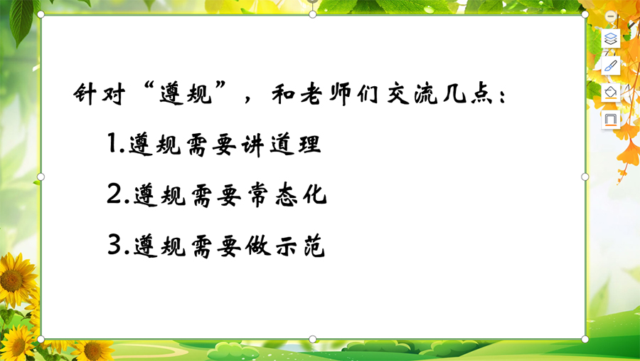 盘点总结,反思进步,用心的设计,规范的课程,教育才能事半功倍。德育副主任于春婷老师对“你好,新学期”登校日课程、“新学期,生生不息向未来”开学典礼课程、“拼搏百日,青春破茧”百日主题课程、“优雅女生、俊朗男生”校园女生节、男生节课程、“阳春布德泽,运动增光辉”阳春体育节开幕式以及新学期班级风貌联检等课程总结亮点,针对课程中的不足之处提出改进意见。于主任结合部门工作传达学校德育月例会的培训核心,以《班主任工作一日常规》为准绳,鼓励班主任老师在学生座位轮换、帮助学生改掉不良小习惯等常规工作落实上要更加注意细节,为学生树立遵规守纪的示范榜样。润心遵规,让教师和少年都成为走在春光里的最美模样,“润心、出神、如意、入微、尽兴”——我们共享教育的福流!